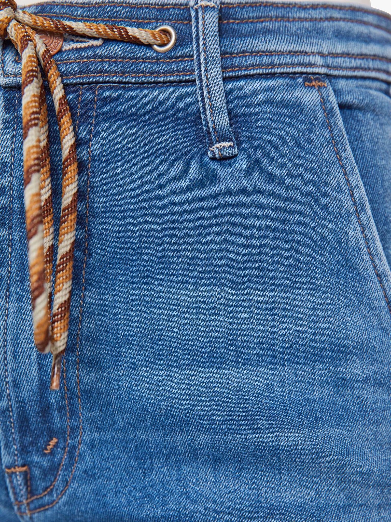 Riddle me that. Wide leg jeans with a high rise, zip fly, colorful drawstring waistband and a long 32-inch inseam with a clean hem. Cut from stretch denim, Fuzzy Wuzzy Was A Bear is a mid-blue with subtle whiskering and fading at the knees.