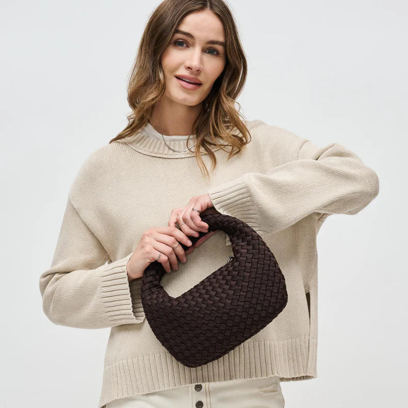 Meet your new day to night bag made from woven Neoprene. Its sleek zipper closure and gold hardware add a touch of elegance to this versatile piece. Perfect for a night out or a stylish day in the city.