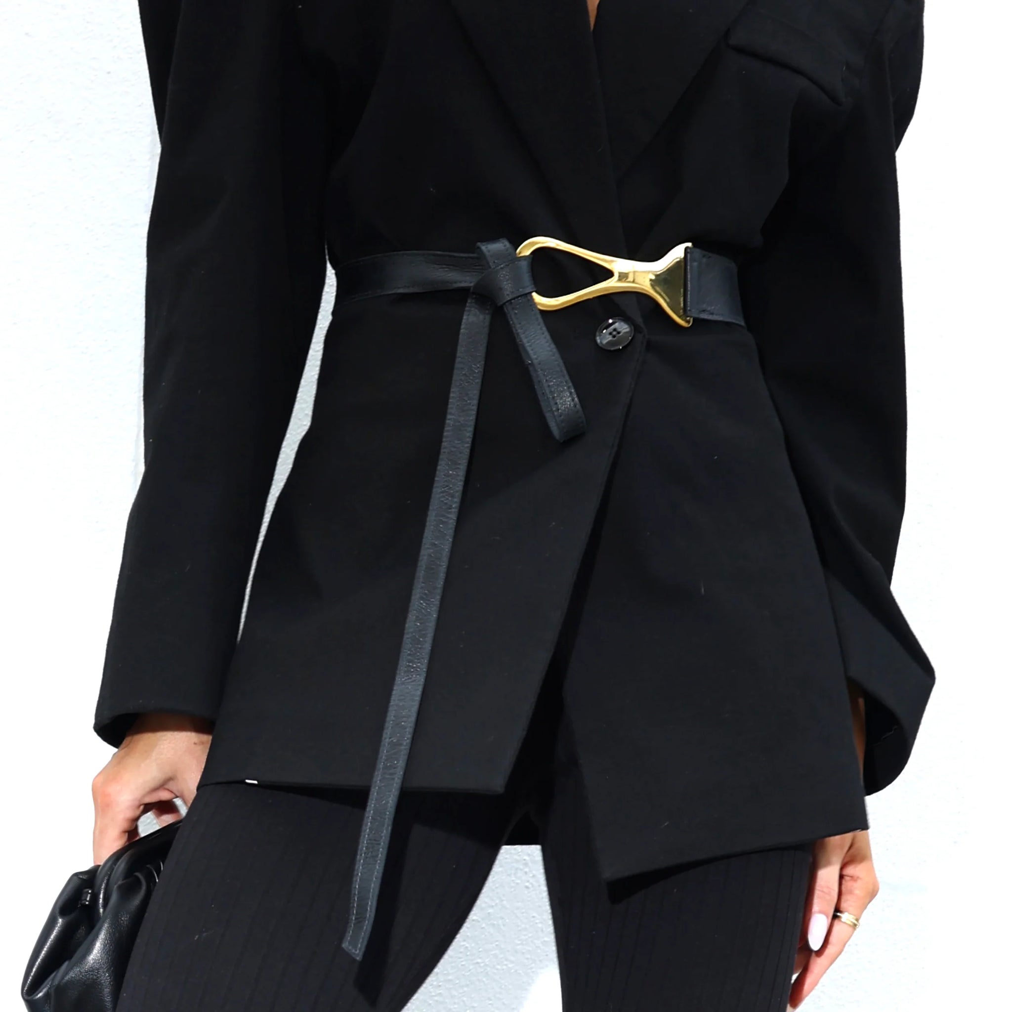 Style the elegant Carolina Tie belt for a night out. Designed in smooth black Italian leather paired with gold hardware.