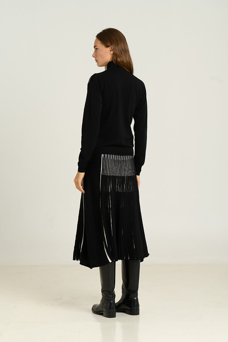 Knit skirt with midi length and elastic waistband. Features a central pleated effect both front and back, with an off-white contrast that creates an iridescent effect. Made in Igualada. Yarn sourced from Italy. The lyocell is FSC-certified, ensuring environmentally responsible, socially beneficial, and economically viable forest management worldwide.