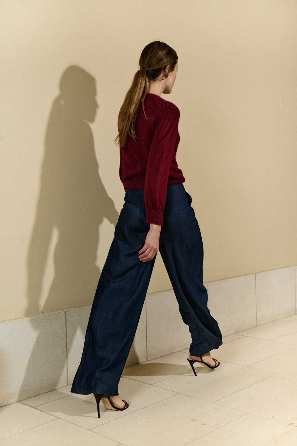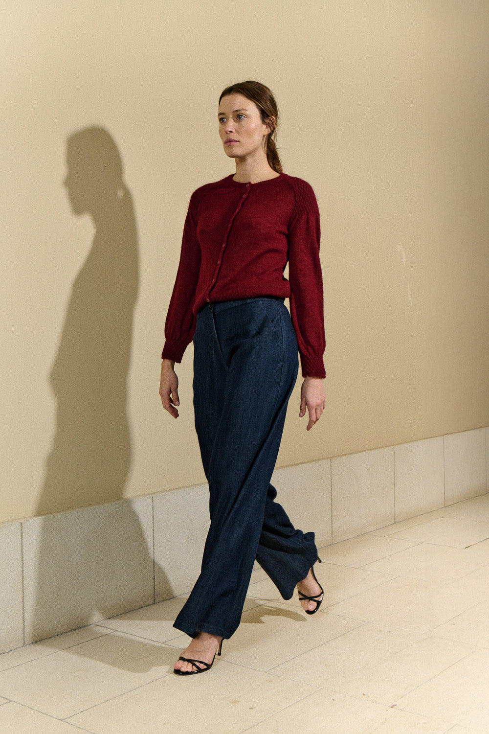Cardigan with honeycomb detail on the shoulders and waist, creating a contrast of textures in the piece. Front closure with buttons. Knitted in gauge 12 in Igualada with Italian yarn. The virgin wool is RWS-certified, ensuring the welfare of the sheep during production. The baby alpaca is RAS-certified, guaranteeing that the alpaca wool has been produced responsibly, both in terms of animal welfare and environmental respect.