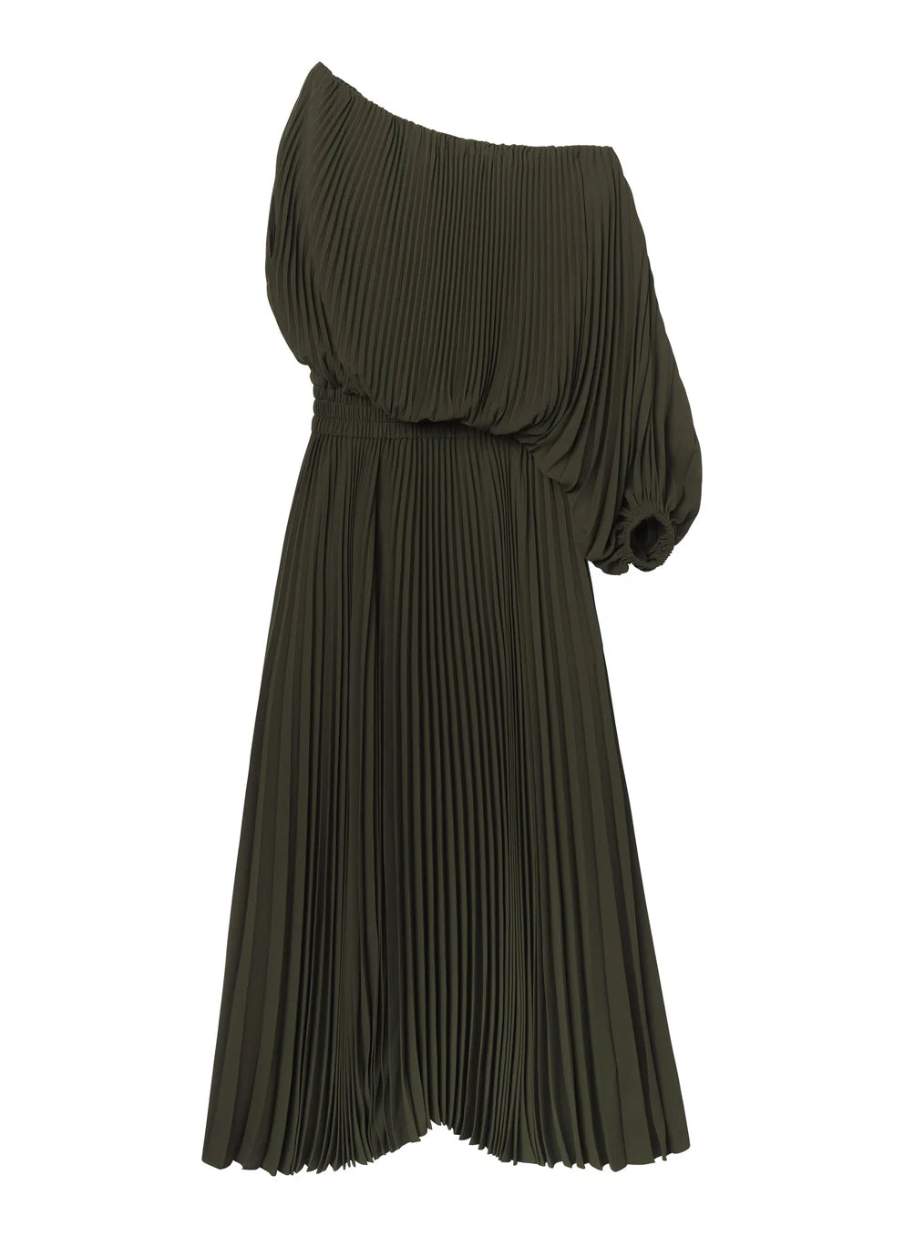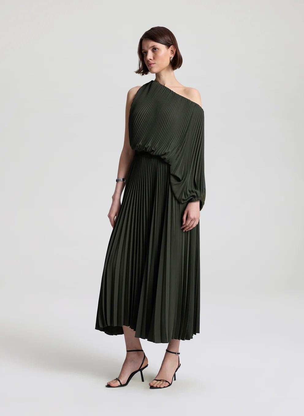 A voluminous single sleeve defines this pleated georgette midi, designed with an asymmetric neckline and billowy drape.