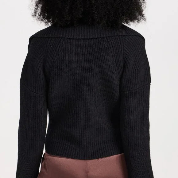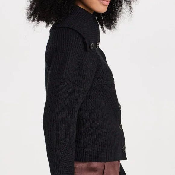 The Suki Cardigan is knitted from fuzzy merino wool in classic black. The details modernize this classic silhouette, including dropped shoulders and buttons that extend through the collared neckline for versatile styling— wear yours wider with a couple of buttons undone or upright as a turtleneck.