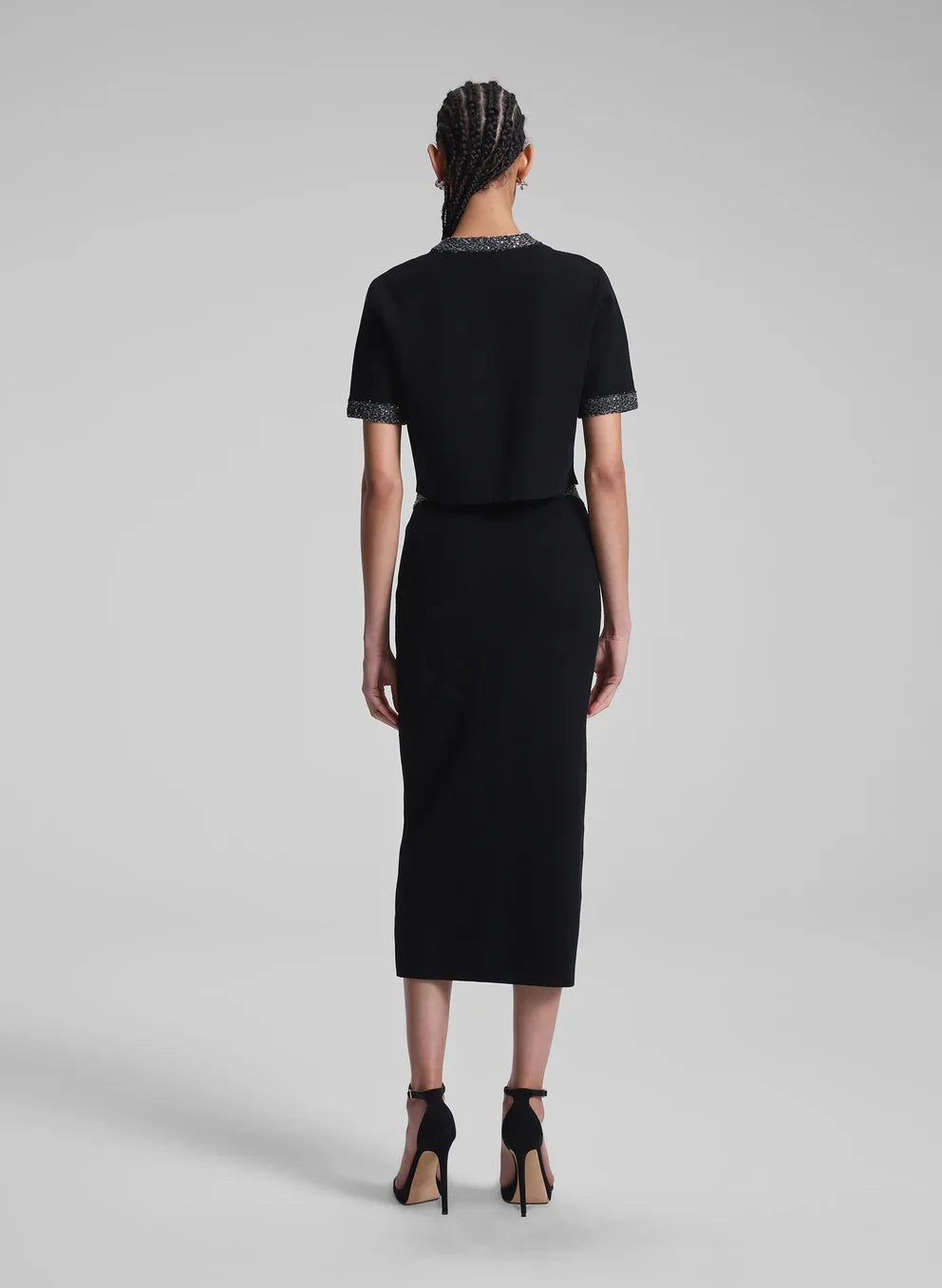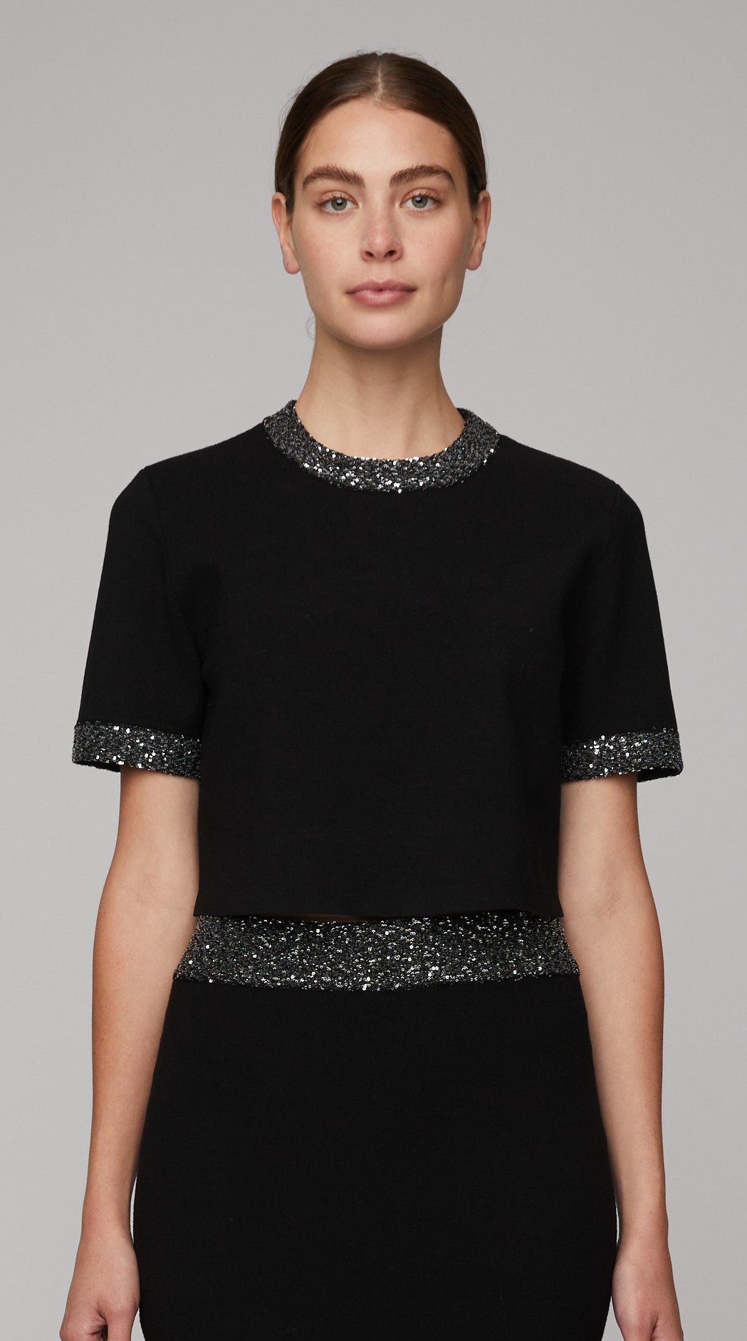 The Maeve Top is crafted from our signature compact viscose knit, combined with shimmering silver sequin yarn for a festive touch. Double-knit trims frame this cropped, short-sleeve silhouette with a high rounded neckline, adding a subtle sporty element that complements its refined yet modern look.