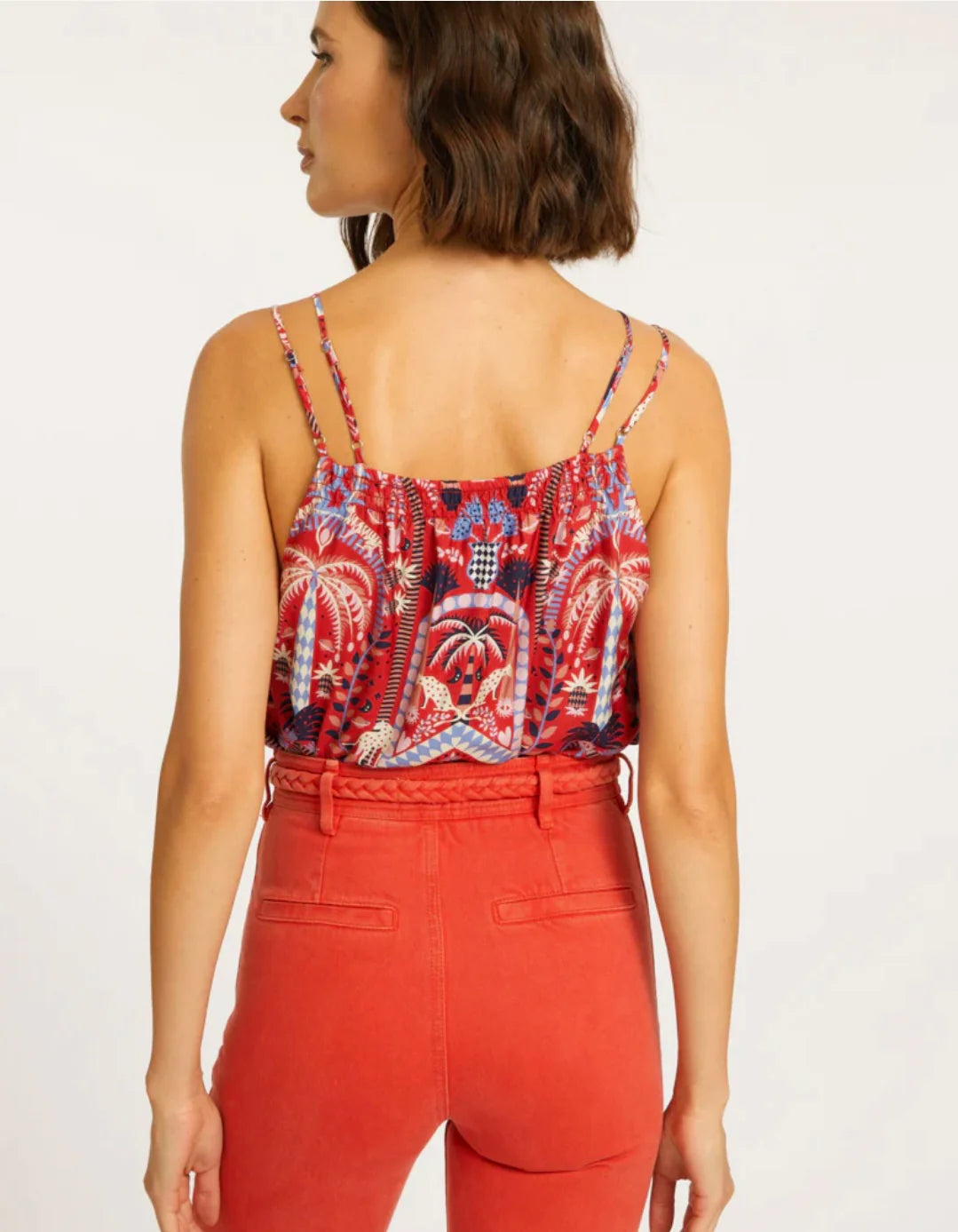 The Cora Top is the perfect tank for spring, designed to keep you stylish and comfortable as the weather warms up. Crafted in a luxurious viscose-silk blend, this top features the bold Ruby Tropics print, with its vibrant red background and tropical desert foliage.