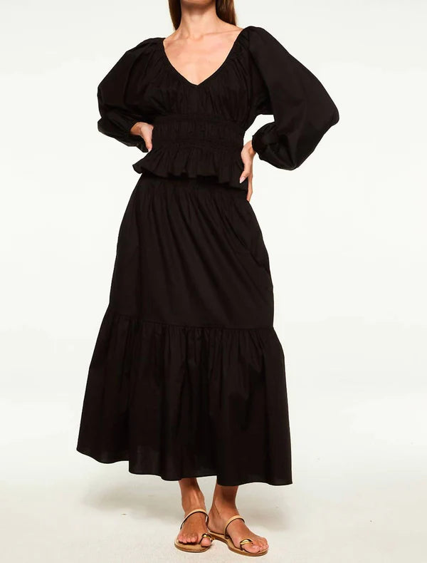 The Elna skirt is a timeless maxi skirt that hits at the ankle, cut from a black cotton poplin. Elasticized ruching as a waist detail with side slit pockets and a wide ruffle hem detail. Pair with your favorite tee or the coordinating Halia top for a chic solid set.