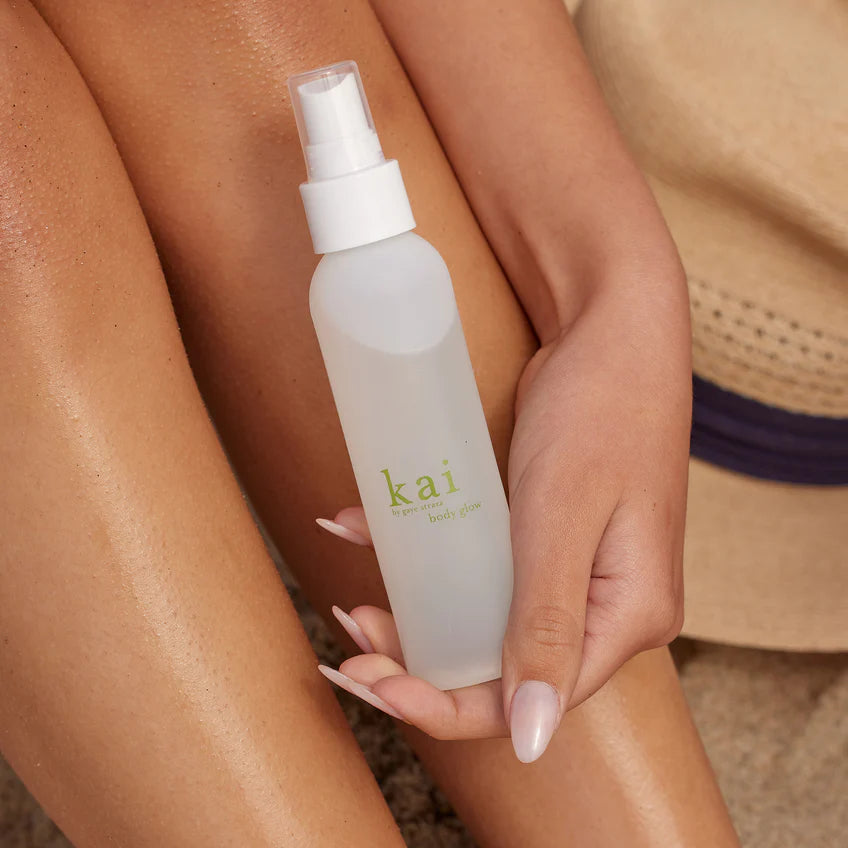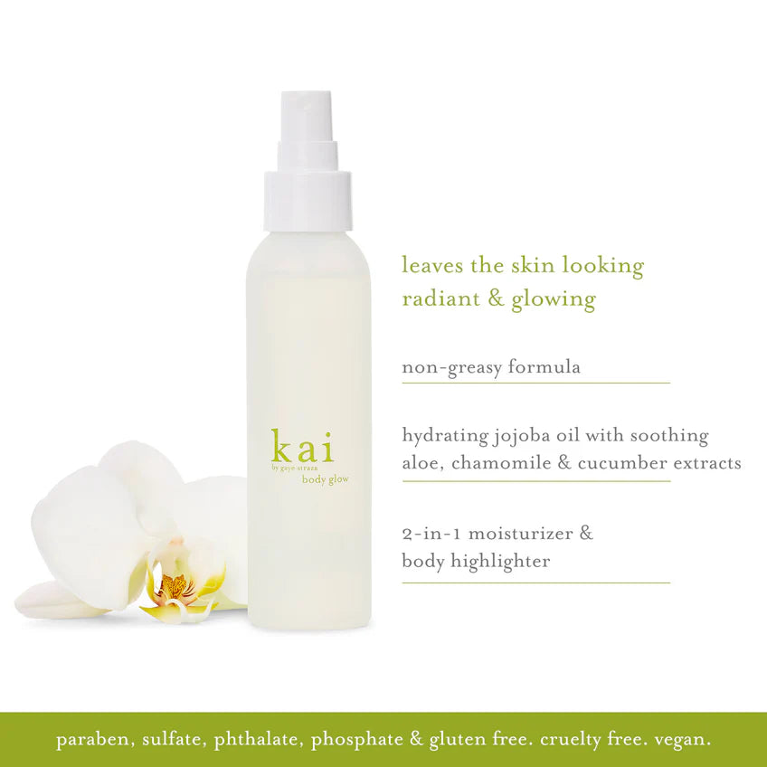 a lustrous and naturally hydrating body mist with jojoba oil, aloe, chamomile and cucumber extracts. fragranced with Kai's signature perfume layered with gardenia or ose absolute, the dry oil spray moisturizes the skin leaving a radiant glow. 4 oz