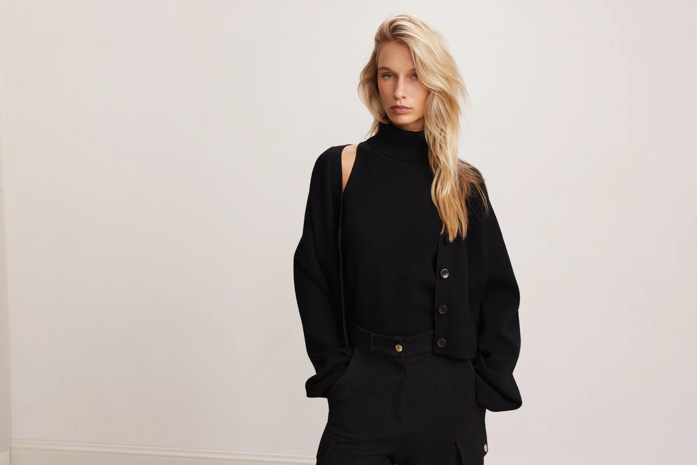 The Olly Sleeveless Turtleneck has a fitted silhouette with a clean turtleneck finish for a sleek shape. Made from soft knit, it works on its own or layered under cardigans, blazers, or the Olly Cardigan.