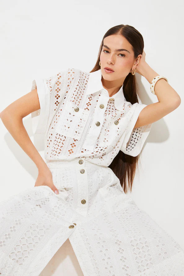 The new white embroidered First skirt from Suncoo has us dreaming of Summer days. The midi length skirt features gold button fastenings, elasticated back and large pockets. Complete the look with the matching Latinos blouse, or style with a t-shirt or cami to suit.