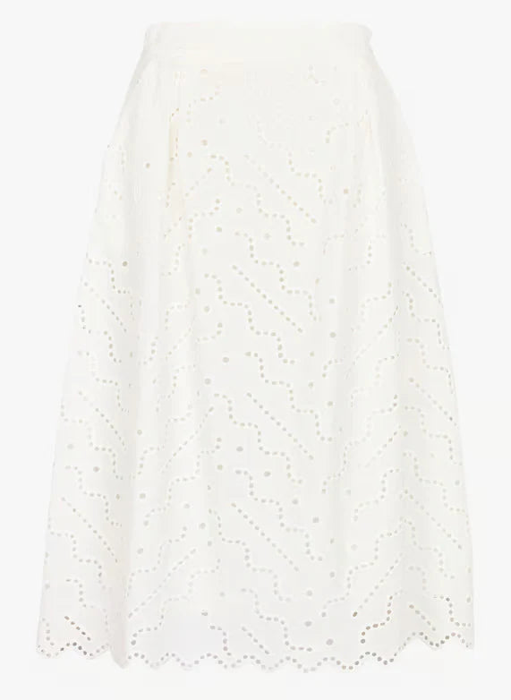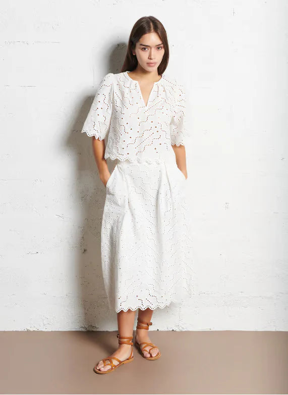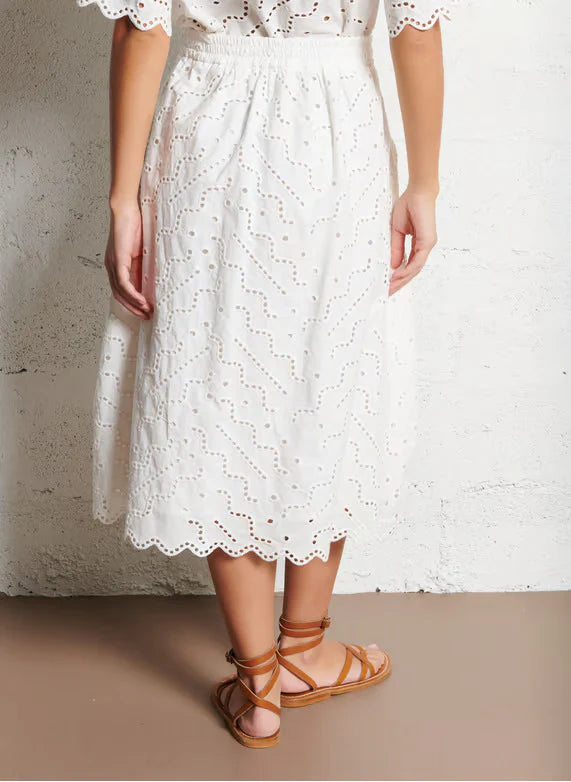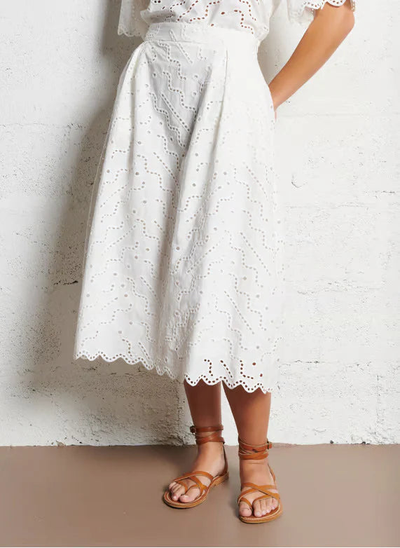 The midi length skirt is here to stay and we especially love this style.Unveil the elegance of the Flavie Midi Skirt by Suncoo, showcasing exquisite geometric English embroidery in a refined Blanc Casse hue. Crafted from 100% cotton and lined with organic cotton, this skirt is designed with both style and sustainability in mind. The hidden side zipper ensures a seamless fit, while two side pockets add a touch of practicality. To maintain its pristine condition, wash on a very gentle cycle with similar colors, avoid tumble drying, and iron to keep its original shape.