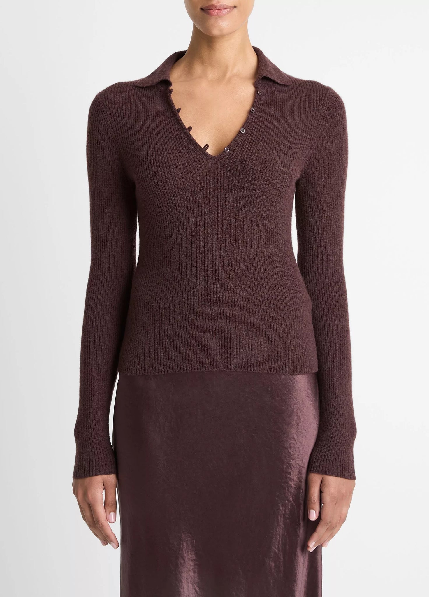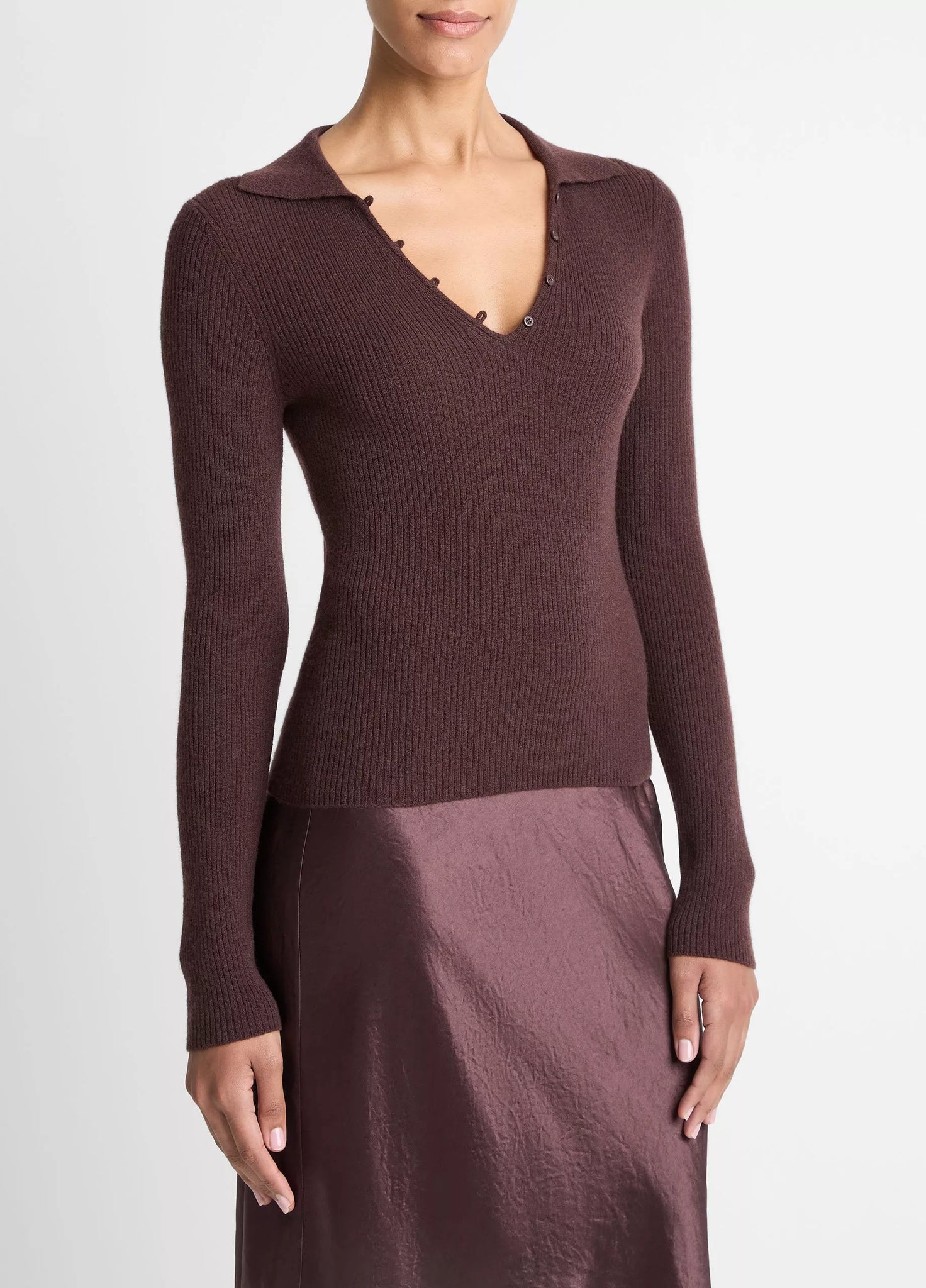 Our refined update to the timeless polo sweater swaps out the traditional placket for delicate button-and-loop fastenings. We knit it from a splendid, ribbed blend of cashmere and silk for a lightweight, airy feel throughout the season's shifting temperatures.