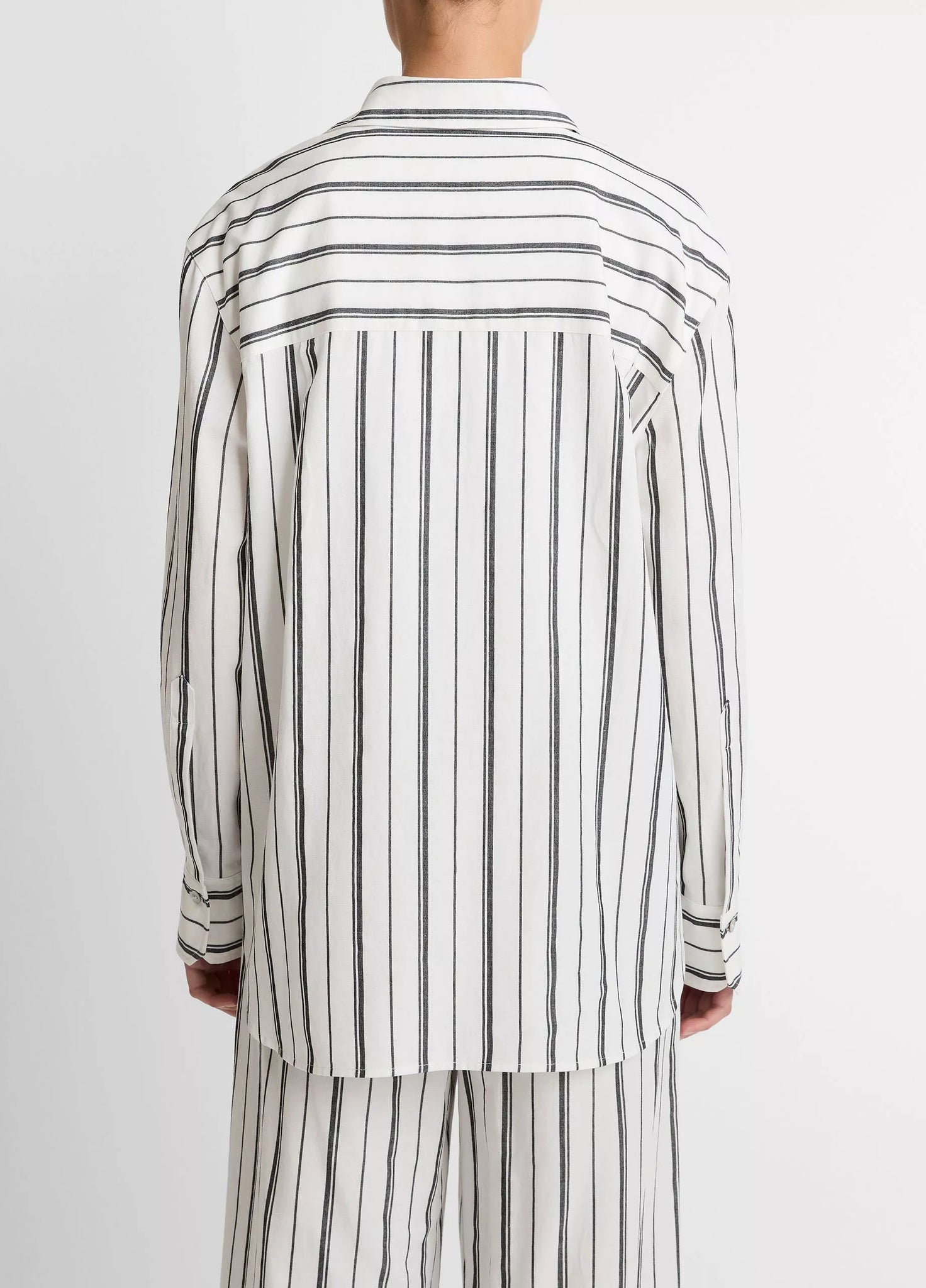 A mix of wide and thin stripes characterize this oversized twill shirt, refined with a point collar, chest pocket and buttoned cuffs. Pay close attention to the back, which we've detailed with a contrasting horizontal-striped yoke for a touch of playful nuance. Take heed: there's a matching pant, too.