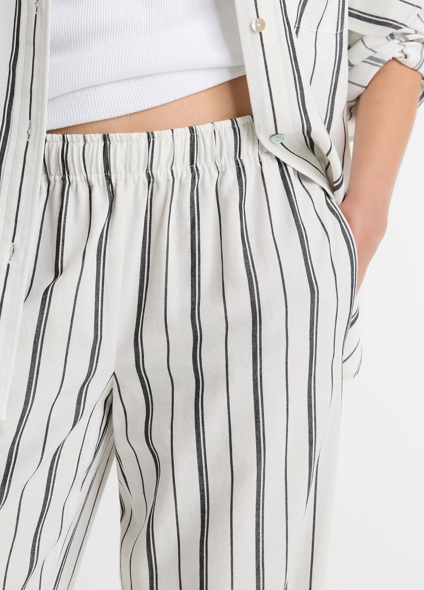 A mix of wide and thin stripes characterize this easy wide-leg pant, designed with an elasticized waistband and hidden interior drawstring for covert comfort. Take heed: there's a matching button-up, too.