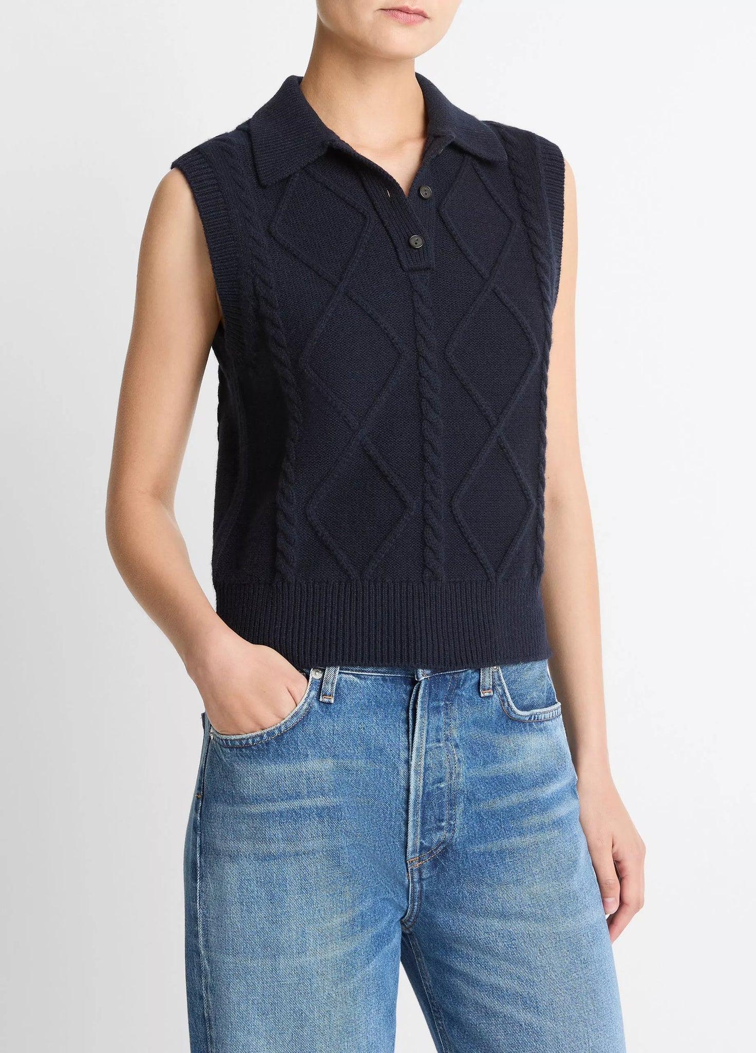 Diamond and cable-knit rows climb the body of our classic collared sweater vest. It's crafted from an Italian blend featuring wool and cotton for a soft-on-the-skin feel and ideal transitional weight to ease from winter into spring.