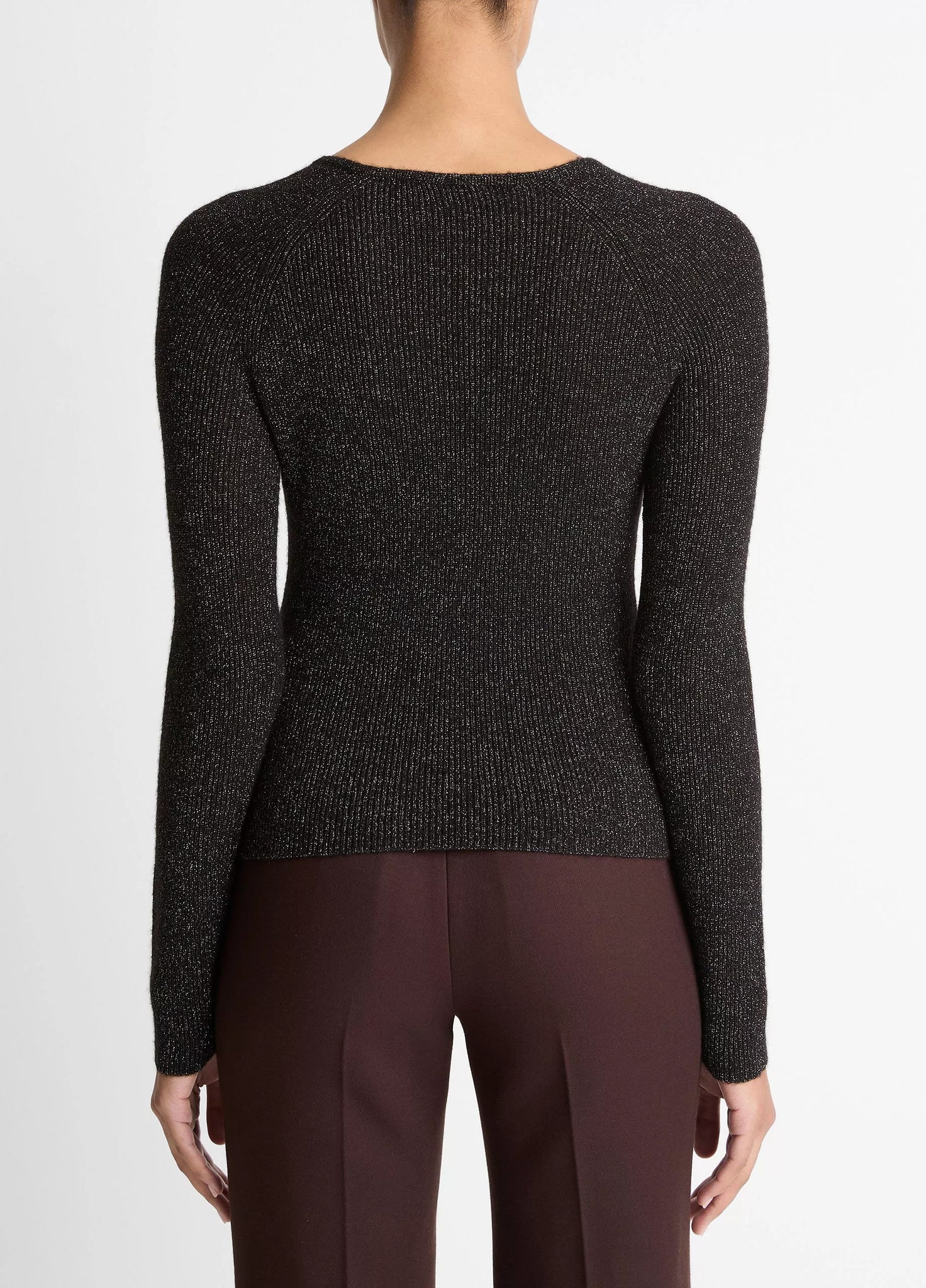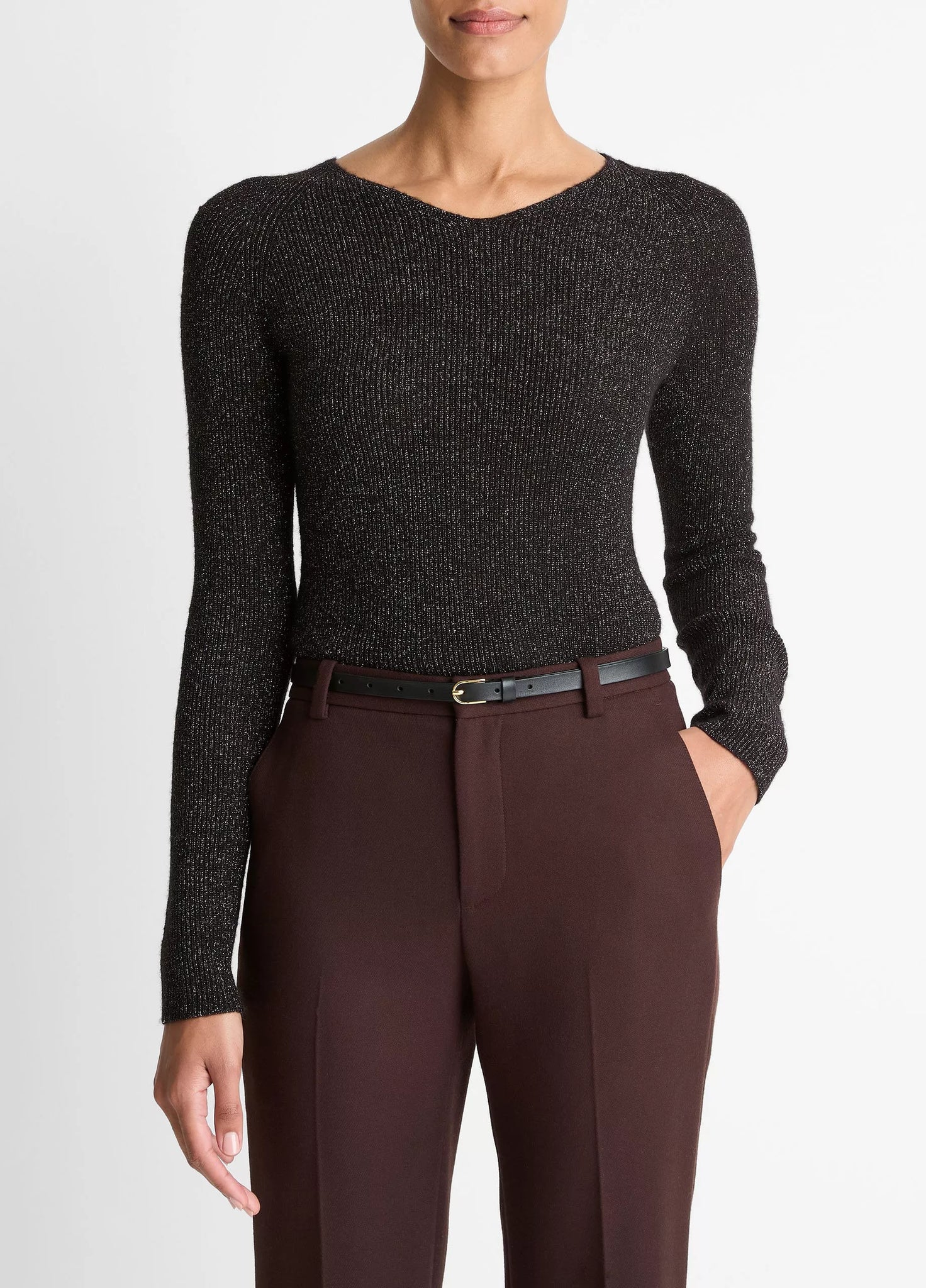 Defined by a high V-neck and slim fit, this lightweight sweater is rib knit from a blend featuring wool and alpaca with metallic threads for subtle shine.