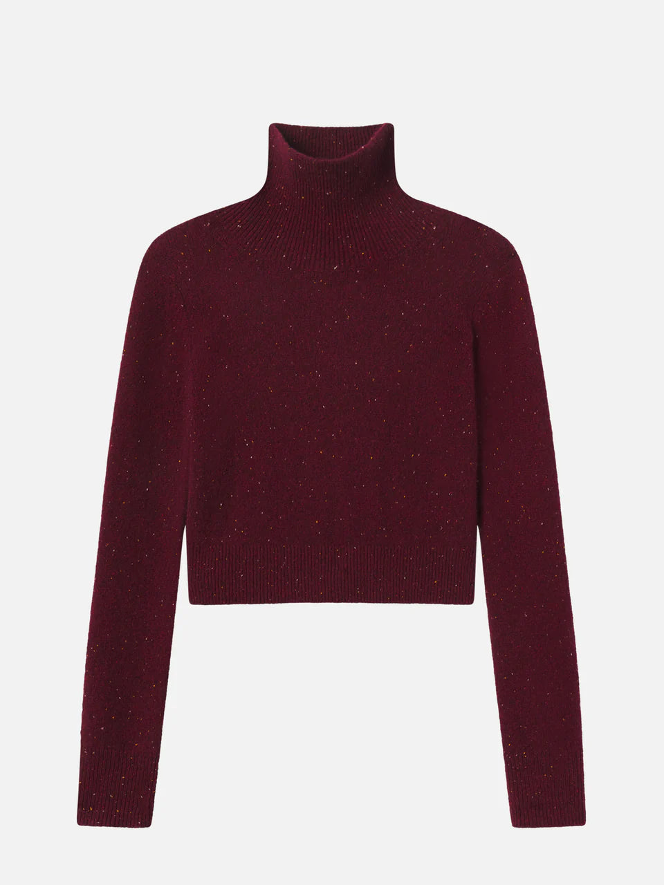 This pure cashmere turtleneck has a rich pinot color base, enlivened by multicolored flecks throughout. A slightly cropped silhouette with a high turtleneck.