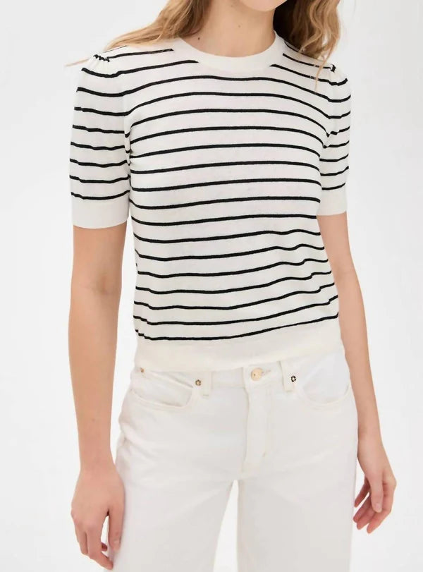 The ultimate go-to sweater, expertly crafted to provide the perfect combination of warmth and style. Its classic design and soft fabric make it a must-have addition to your wardrobe. This piece features short puff sleeves and a classic crew neckline, offering a modern twist on a retro style. Crafted from a lightweight knit composed of 35% cotton, 35% lyocell, and 30% linen, the sweater is designed for comfort and elegance. Dry clean only. Crafted in China, this piece is perfect for a music festival celebration or a stylish New Year's Eve gathering. Garment length: 19.75 inches.