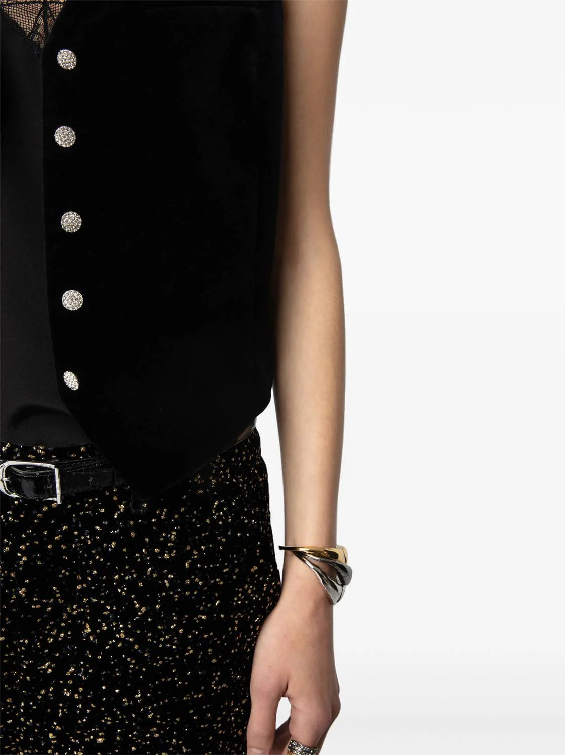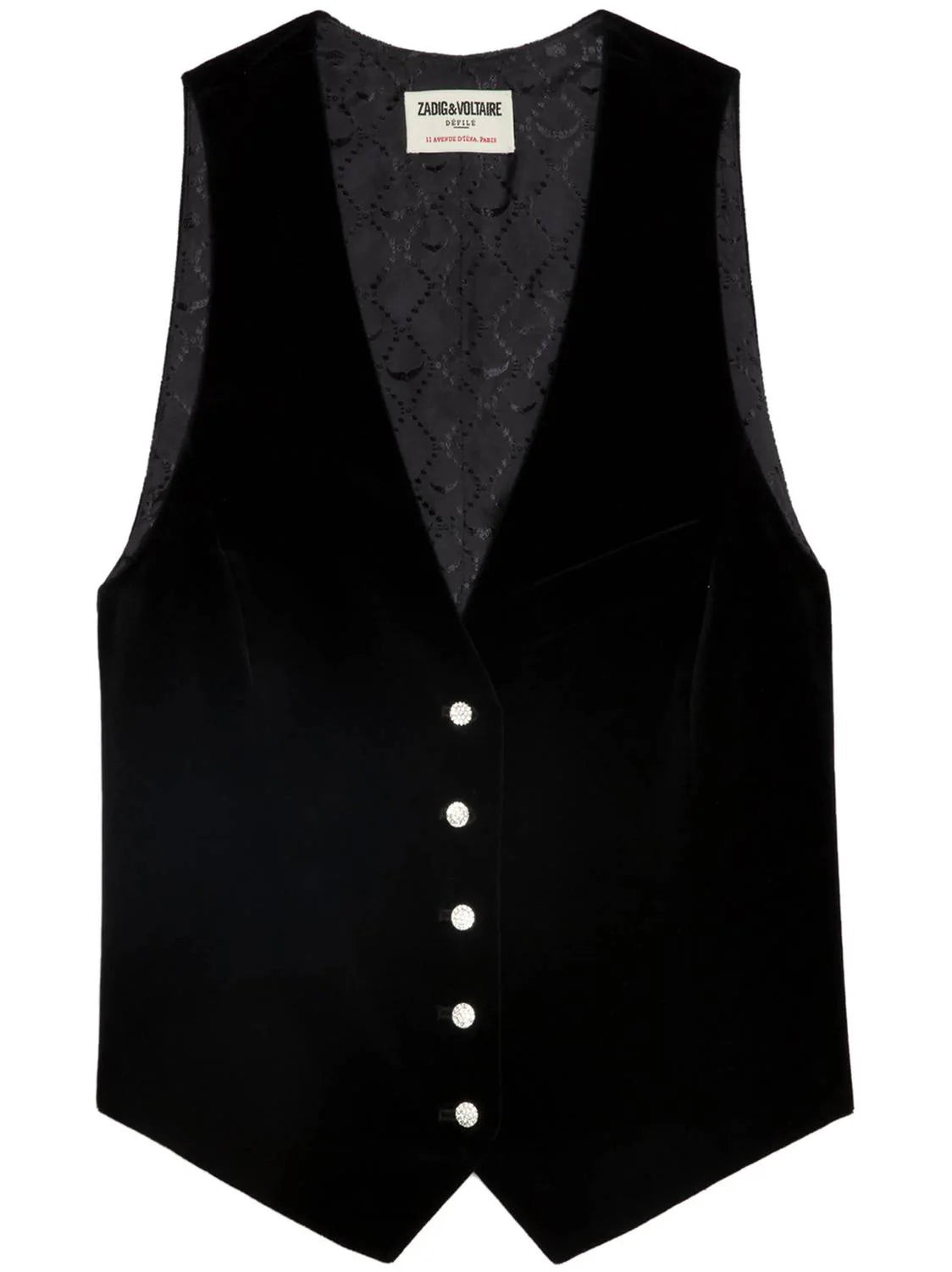 A vest so versatile you can mix and match it with almost any outfit and it will feel brand new every time. Introducing the Emaux Velvet Vest by Zadig & Voltaire, a luxurious addition to your wardrobe in elegant noir. This sleeveless piece is crafted from sumptuous velvet fabric, adorned with dazzling diamante embellishments, and features a v-neckline and front button closures. Composition includes 100% cotton with a 100% viscose lining, ensuring comfort and style. Care for this exquisite vest by opting for dry cleaning to maintain its pristine condition.