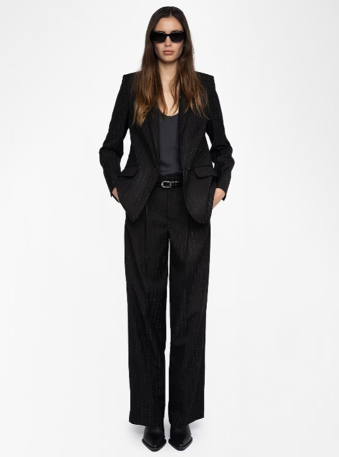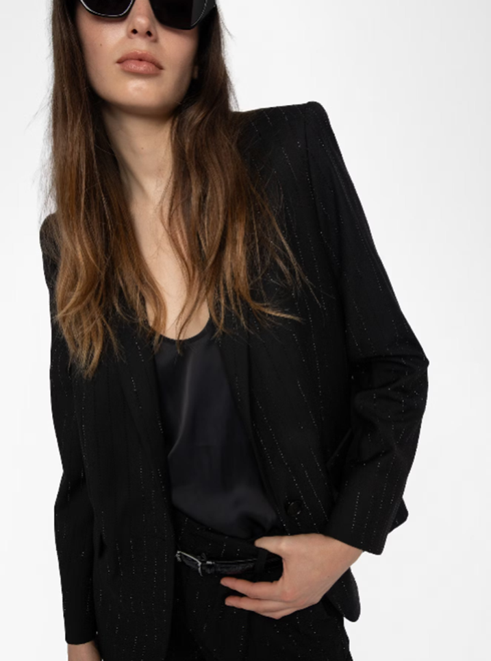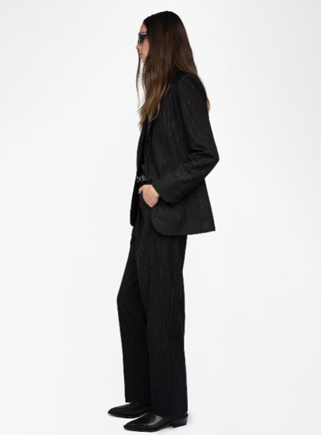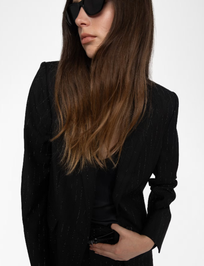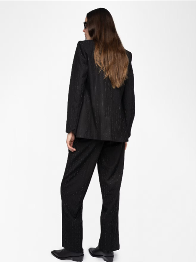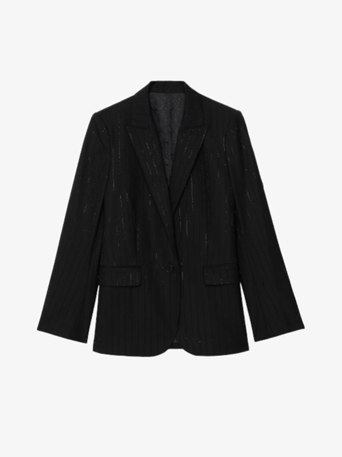 Structured straight blazer in strass suiting with button closure.