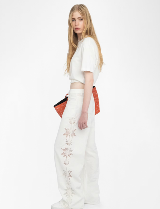 Fashioned from luxurious white linen and cotton fabric, the Elfy trousers ensure unparalleled comfort and effortless breathability, with a tactile fiber structure that radiates natural opulence. Intricately placed along the side seams, delicate star-shaped lace insets infuse the design with poetic allure and whispers of sheer sophistication.
