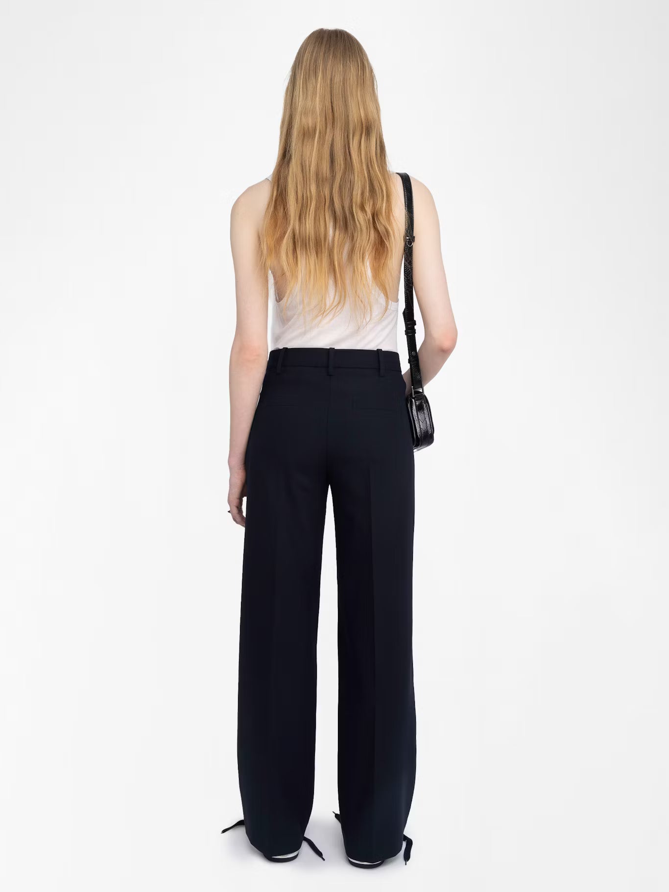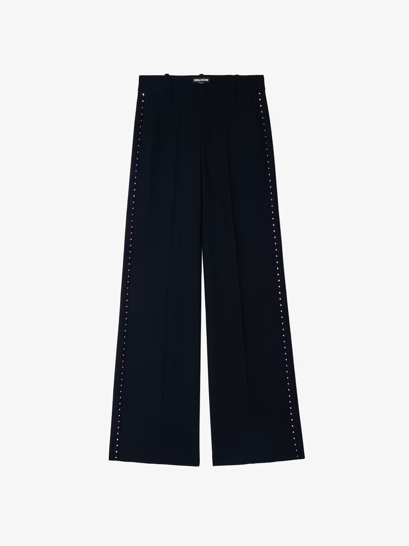 Wide-leg tailored pants with rhinestones.