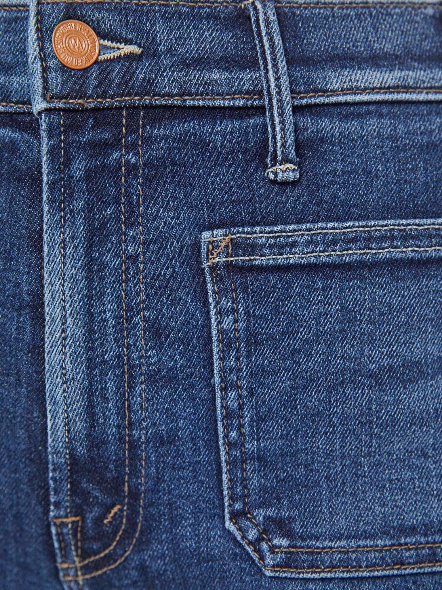 Hail Mary. 70s-inspired wide leg jeans with a high rise, zip fly, patch pockets, 31-inch inseam and a clean hem. Made from stretch denim, One Last Shot is a dark blue with subtle whiskering and fading at the knees.