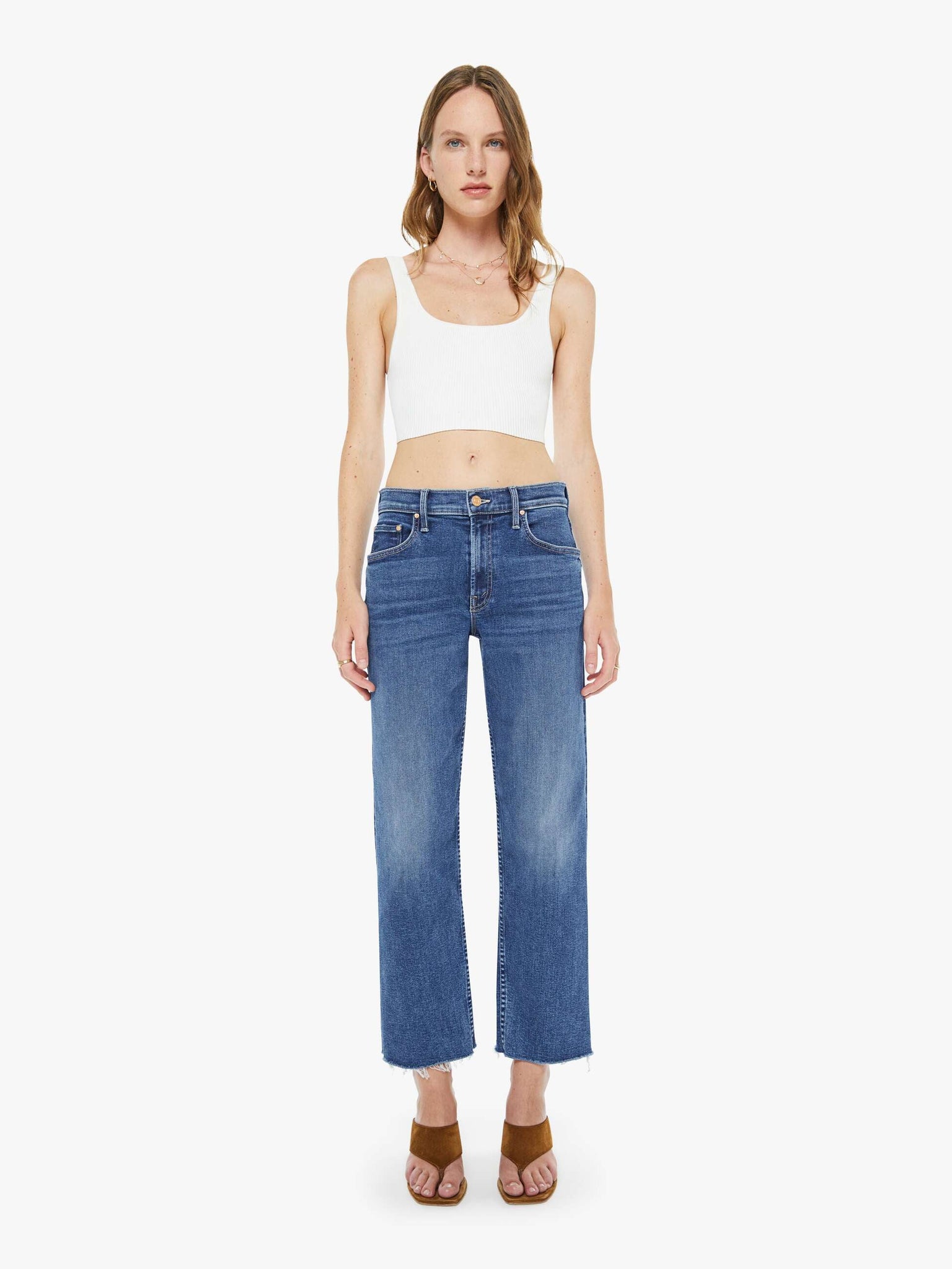 Hidden treasure. Mid-rise straight-leg jeans with a zip fly, ankle-length inseam and a frayed hem. Made from stretch denim, Prized Possession is a mid blue with subtle whiskering and fading at the knees.