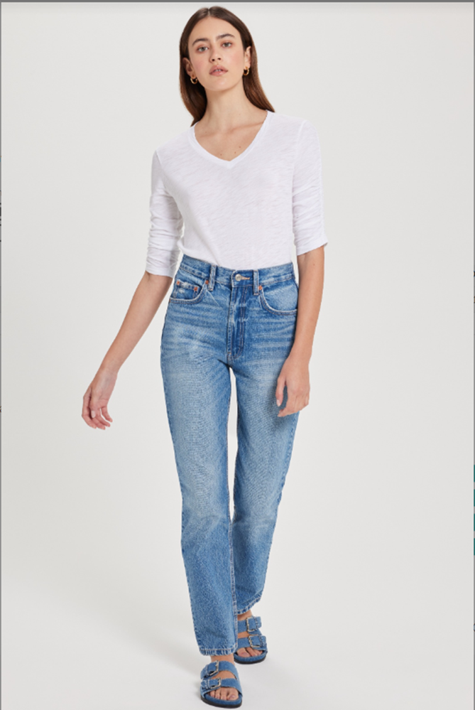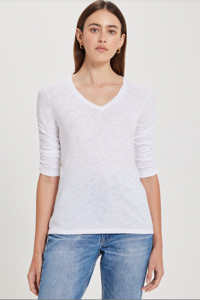 Point of interest: our go-to half-sleeve tee, now with a V-neck for variety. Ruched sleeves add just enough texture to keep things interesting.