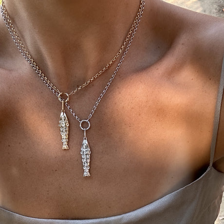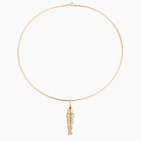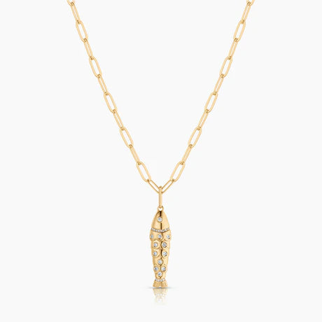 An all-metal fish charm enveloped in glittering scales and fine details. She blends seamlessly into a mix of beads and CZ charms, or layered into a nautical neck stack. Textured, sparkly, and everything you ever dreamed of.