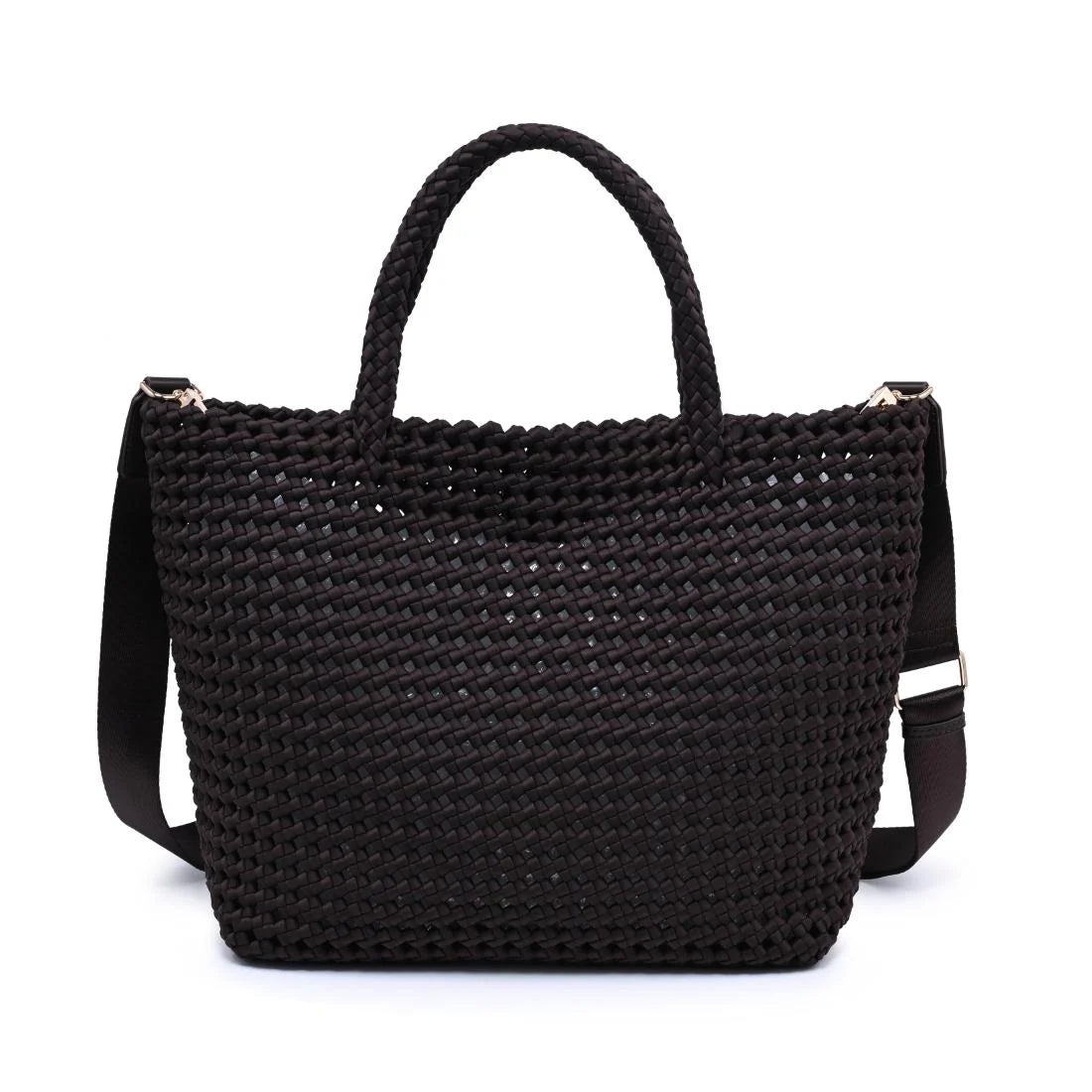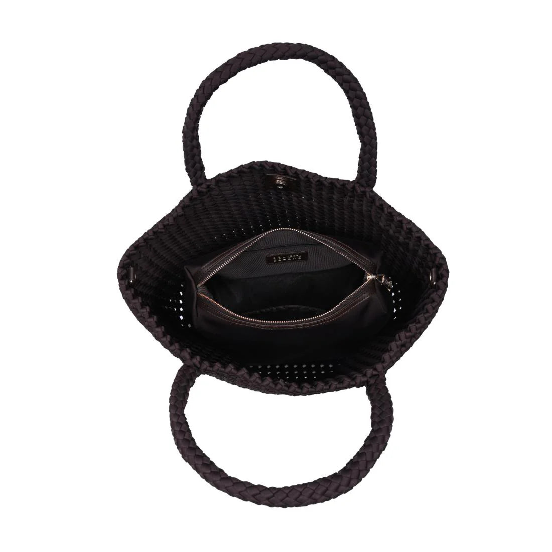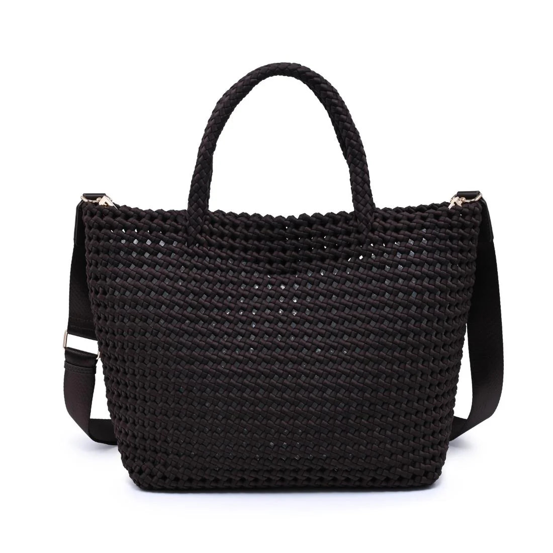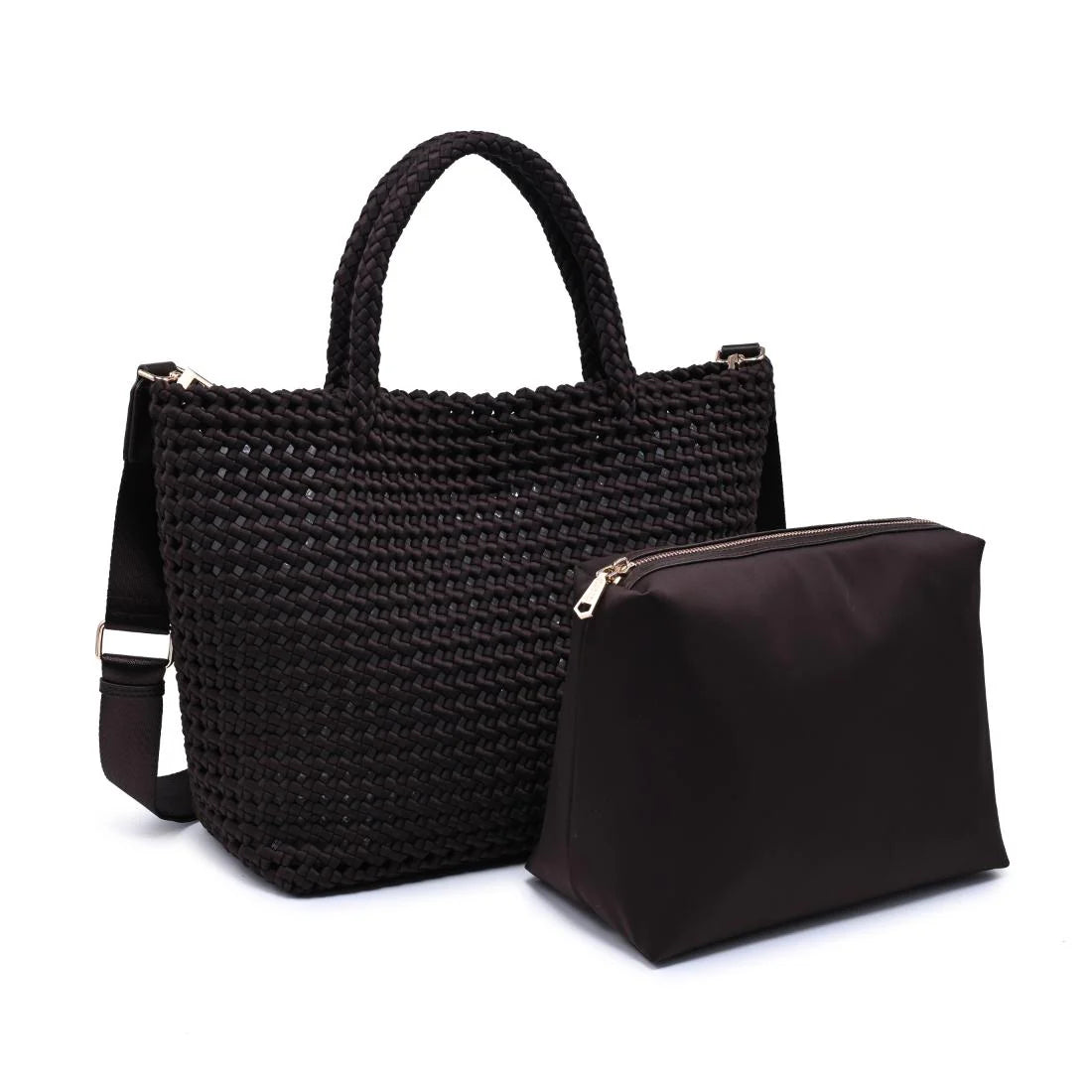 Ambrosia Medium Tote — a woven silhouette with go-anywhere functionality. Lightweight, structured body with dual top handles and an adjustable crossbody strap, plus a secure zip top for commute-ready confidence. Includes a zip pouch for small essentials; roomy interior fits a tablet, workout kit and everyday must-haves. Sporty-chic and versatile, it moves effortlessly from office to studio to weekend plans.