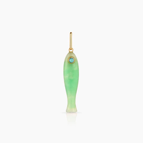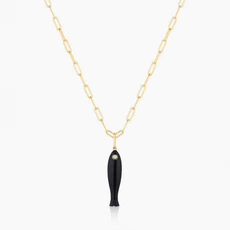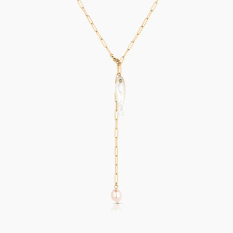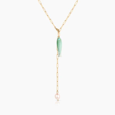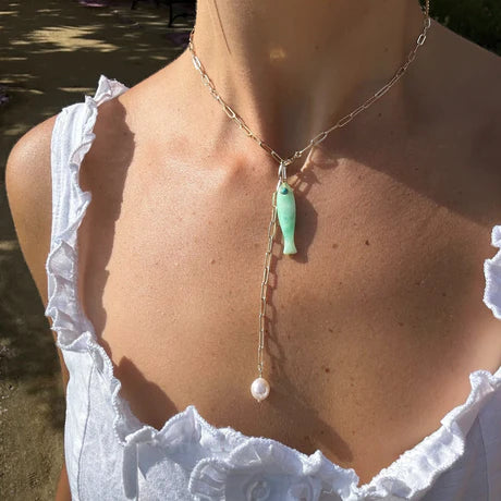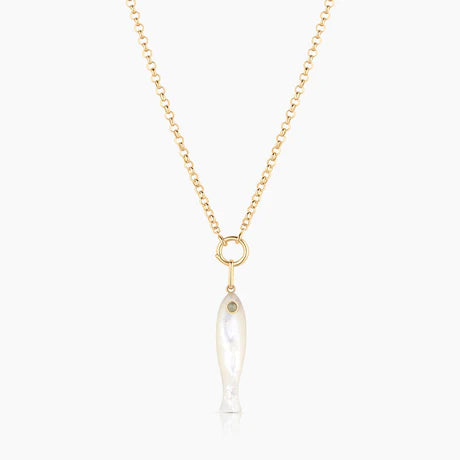 She's a best seller for a reason. Our new favorite hand-carved gemstone fish charm has quickly become the must-have charm of the season. This mother of pearl fish (with an amazonite eye!) can be worn alone on our Monet Choker or necklace chains, or layered with your other favorite charms. Our Fortuna isn't just a cute charm, it's a little amulet for good fortune and luck.