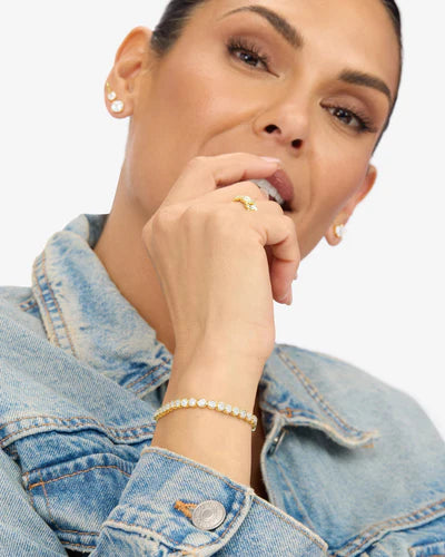 Our iconic Baroness Tennis Bracelet is our modern take on the classic tennis style bracelet. With bezel set simulated diamonds, this tennis bracelet dazzles from all angles and in the perfect size to be worn no matter the occasion, day or night.