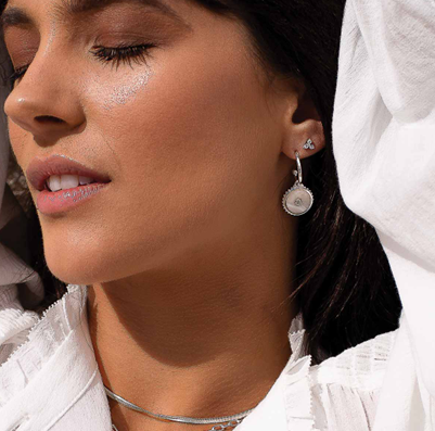 Small Hoop earrings featuring a shield symbol of Mother of Pearl and White Topaz. Mother of Pearl protects the wearer from harmful energy, while White Topaz helps the wearer focus on love and offers clarity for the future. Pearls symbolise wisdom and are valued for their calming effects, helping manifest peace and strength.