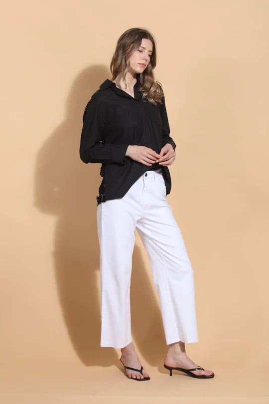 Cut from crisp, refined cotton, this shirt features three-dimensional floral lace appliqué cascading across the back. Subtle from the front, unforgettable from behind.