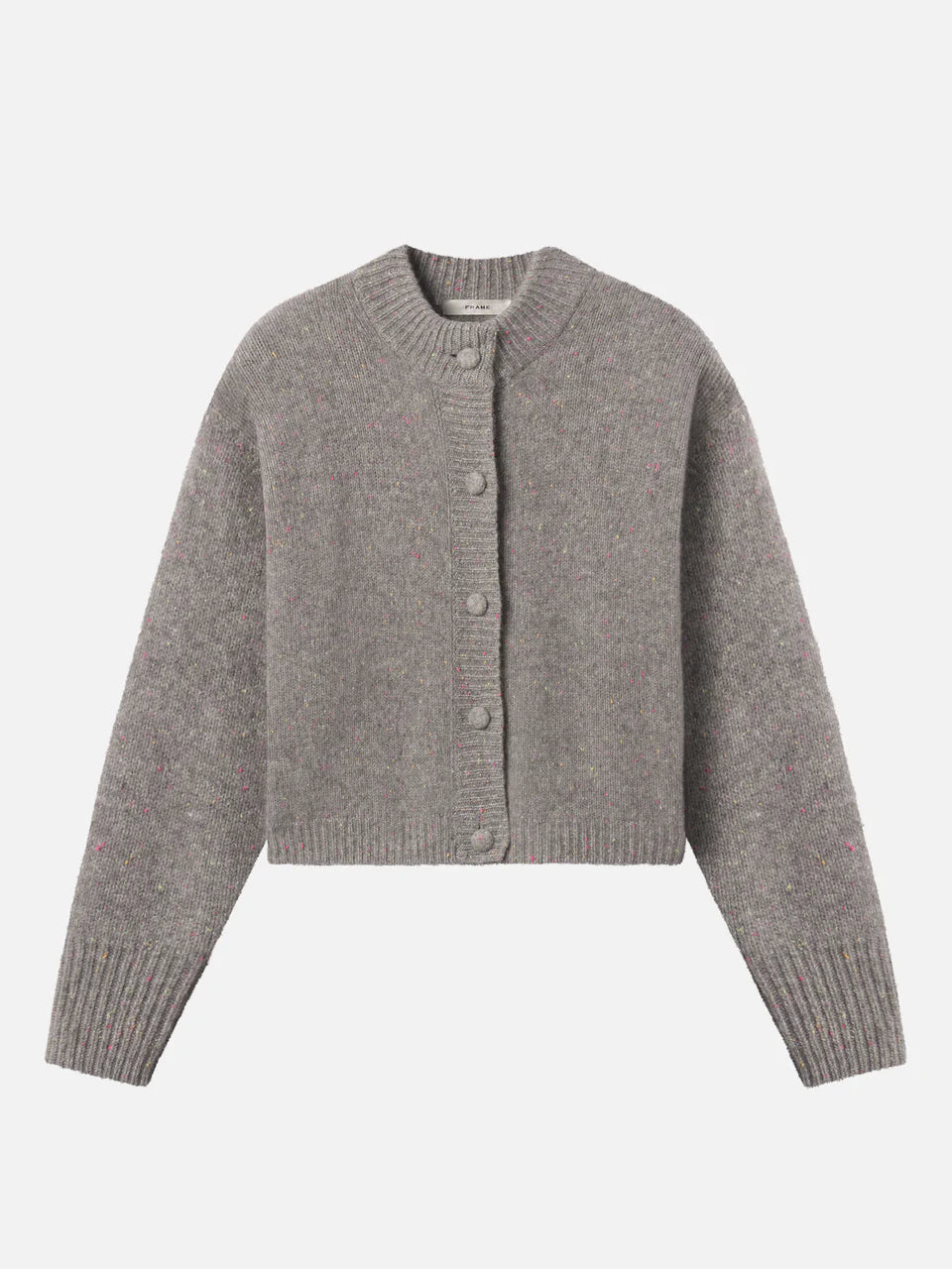 This pure cashmere cardigan is knit in a light grey yarn, envlivened by multi-colored flecks throughout. A relaxed silhouette, ribbed at the neck, cuff and hem and finished with luxe self-covered cashmere buttons.